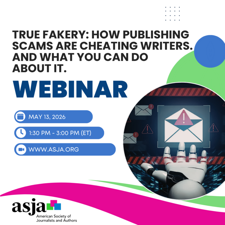 In this ASJA must-see webinar, join four of the world’s leading investigators of publishing scams, Burke among them, who will tell you how to detect and protect yourself from on-line scammers and seek legal resolution if you have been scammed.