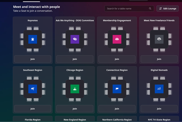 This year, the Writer’s Lounge will host tables for ASJA regional groups, and the ASJA member-initiated affinity groups that typically meet via Zoom. There will also be several unassigned tables where attendees can set up their own impromptu meetups. Airmeet’s built-in direct messaging feature makes it easy to reach out to other attendees on the fly and invite them to join you at a table.